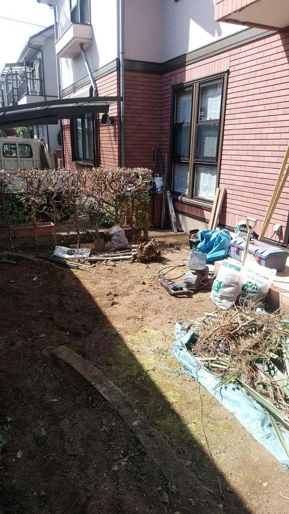 ウッドデッキの土台兼ウッドフェンスの柱になる7センチ角の柱を埋設設置していきます。